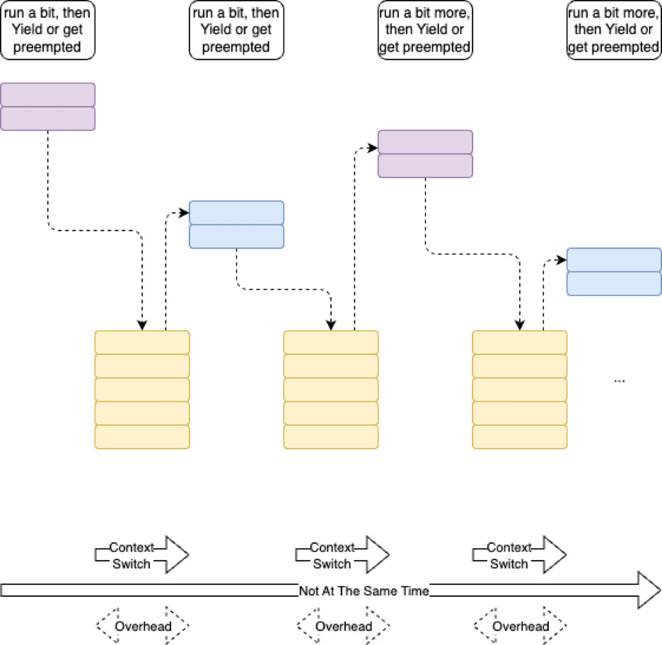 Context-switching happens so quickly as to fool the human eye. The tasks run sequentially, but get swapped in and out so quickly that humans perceive the tasks to be running at the same time, even though that is not what happens.