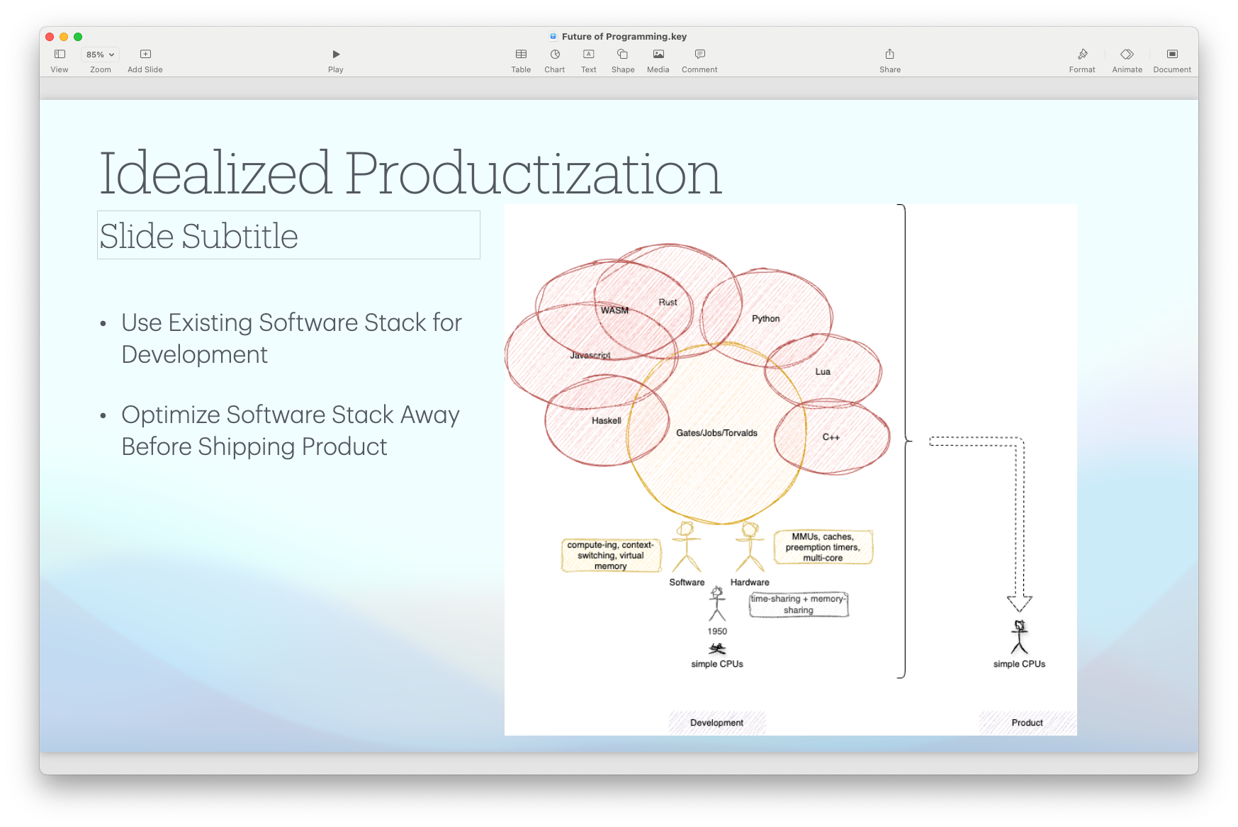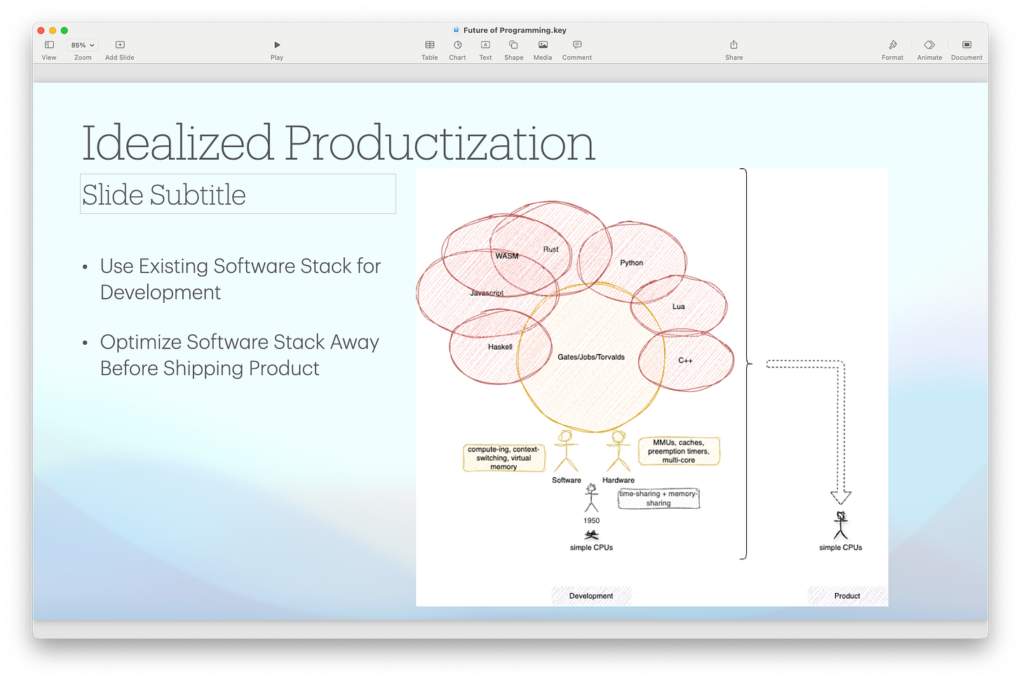 Too much emphasis on how to optimize the development experience based on 1950s primitive ideas about IDEs (aka “programming languages”), instead of optimizing away bloatware.