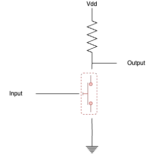 Basic Setup: A transistor is connected with its emitter to ground, its collector to a resistor (which connects to power supply Vdd), and its base receives the input signal.