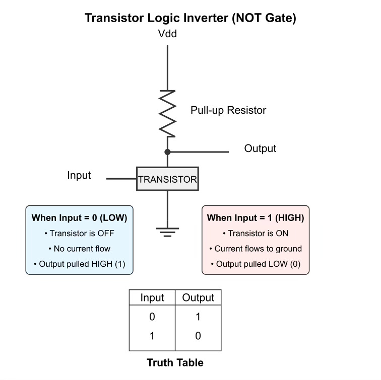 This simple circuit forms the foundation of digital logic and is a building block for more complex gates and circuits in digital electronics.