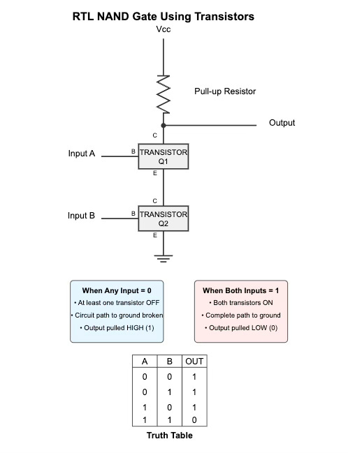 Resistor-Transistor Logic (RTL) was one of the earliest forms of digital logic used in early computers. Let me explain how an RTL NAND gate works using NPN transistors.
