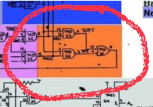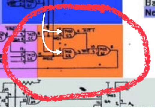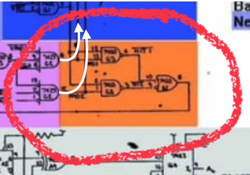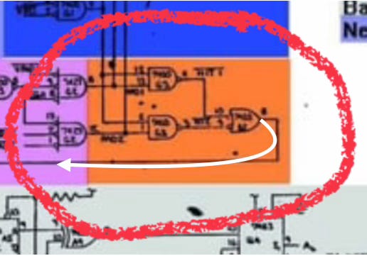 Another input comes from the blue section above. How did I know? I know how to read schematics and I see that the left-most of the 3 lines that cross between the orange and blue sections feeds an input of the lower logic gate (a NAND gate, I can’t read the name of that gate, because of the poor resolution of this image)
