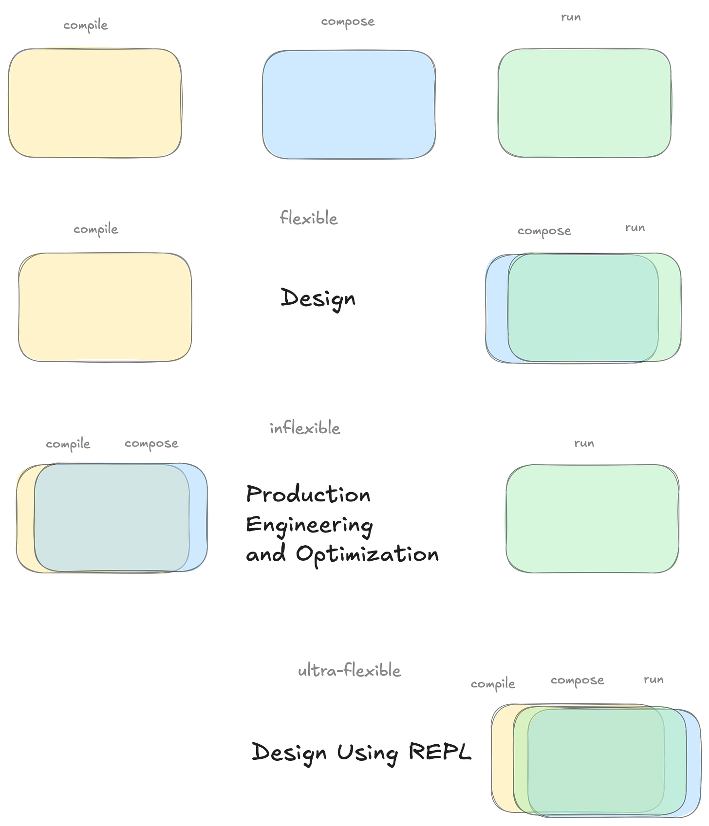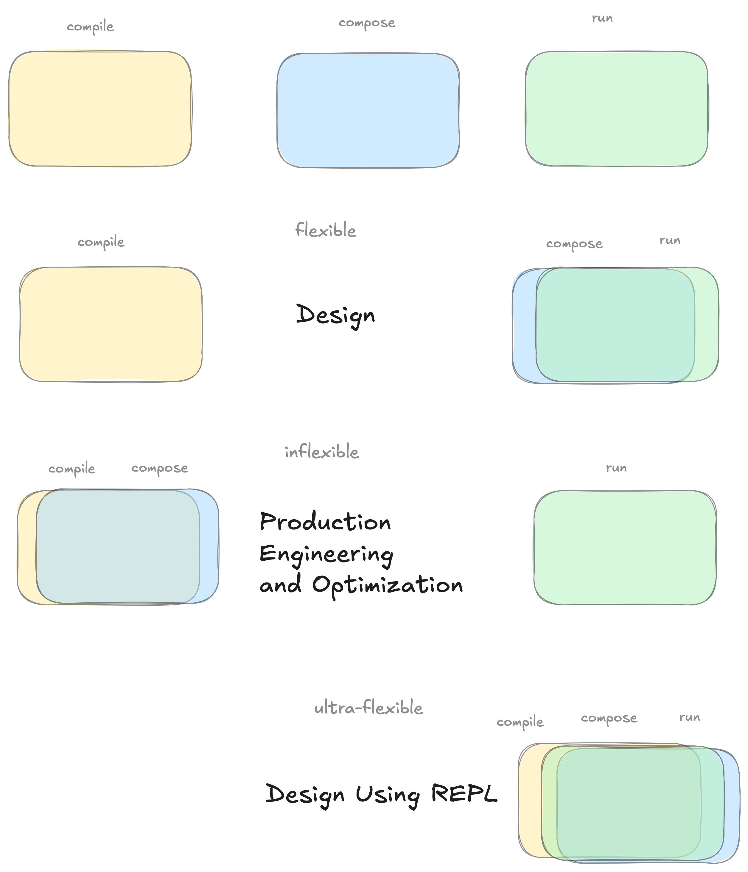 Perform compilation, composition and execution on-the-fly, resulting in an iterative, REPL workflow.