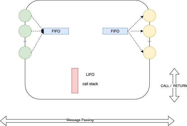 Message Passing uses FIFOs (queues), CALL/RETURN uses LIFOs (stack).