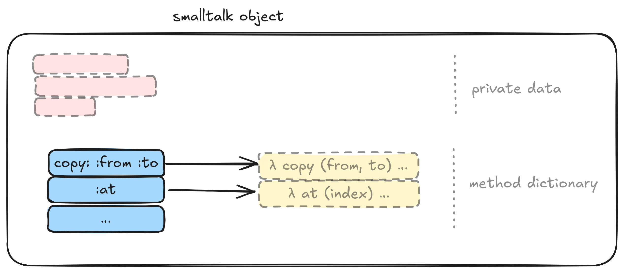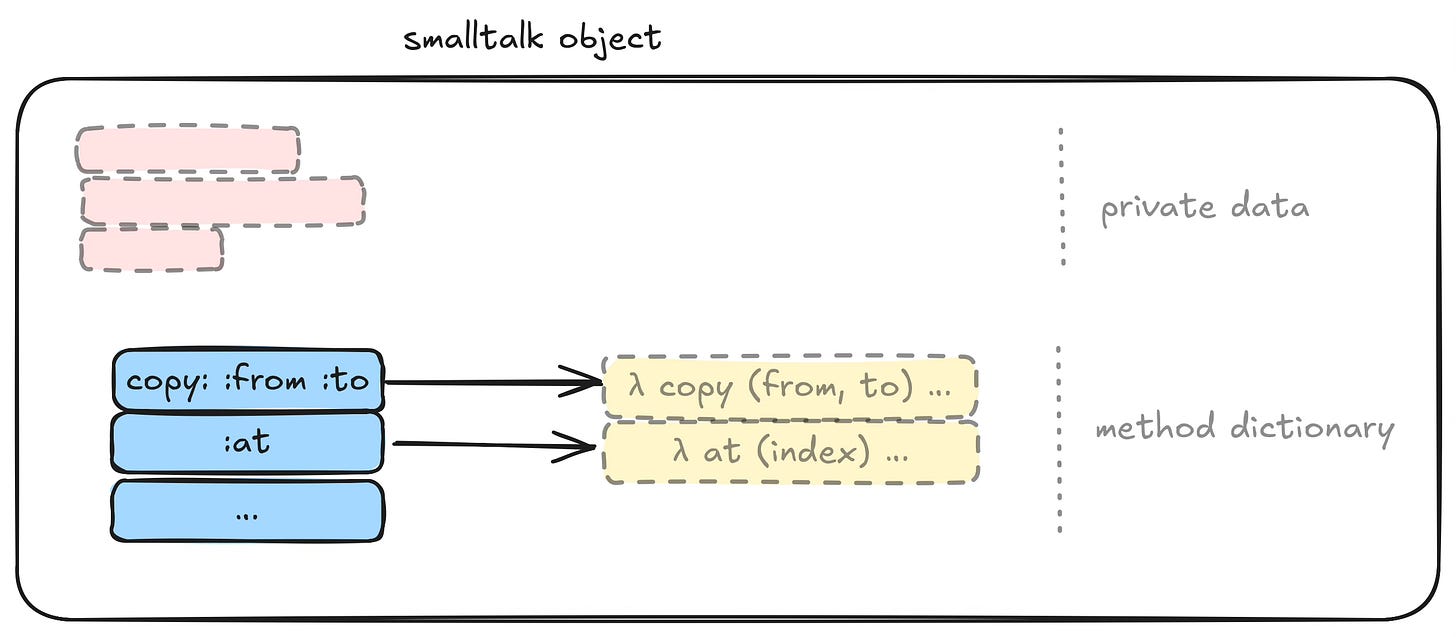 Smalltalk purports to use message passing, but, instead, uses synchronous function calling with multiple entry points into closures. Calling a method in Smalltalk is essentially an invocation of a closure containing private data that does a dictionary lookup (“switch”) on the incoming method name for synchronously calling the appropriate function.