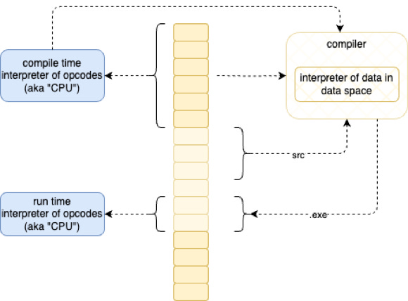 and, we use the “compiler” to mean “pre-processing optimizer” which does some of the double-interpretation work earlier before the work gets sent to the hardware interpreter in the hopes of amortizing some of the hardware-based interpretation across many runs of the same block of bits.
