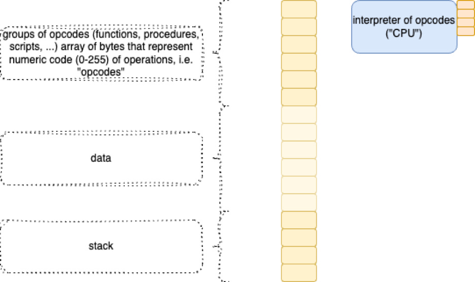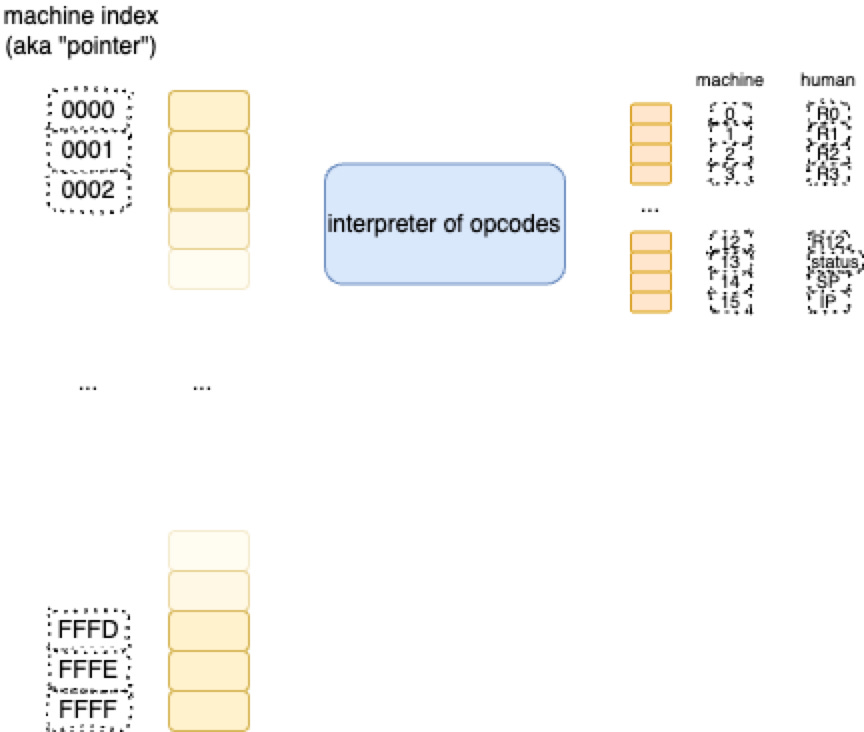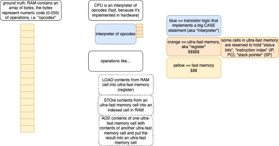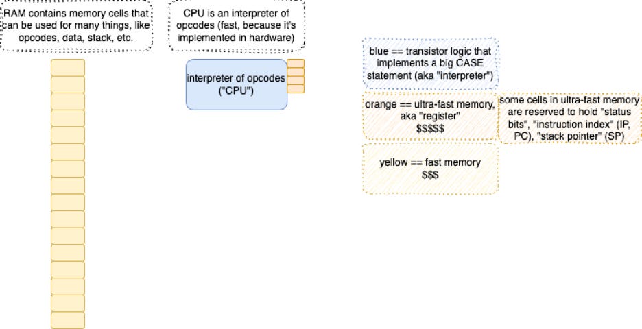 The stack (3) is assumed to contain bookmarks - “return addresses” which are just indices of places in opcode space - and various other kinds of stuff, like parameters and return values and temporary values, and, etc. Note that “the stack” is really just an array of a mixed bag of stuff (“heterogeneous” array). The interesting part is that the CPU reserves the use of one of its registers to act as an index into the stack. Usually this register is given the name “SP” for “stack pointer”. Certain opcodes (see below) cause side-effects that bump the SP up or down automatically, instead of in a random indexing manner. The hardware can do such auto-bumping faster than if these actions were separated as stand-alone opcodes.