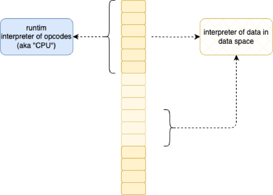 The ball of logic that constitutes the guts of a CPU, is just a big CASE statement, that interprets the meaning of every opcode - every set of bits in the “program”/“opcode” space of memory. The CPU is an interpreter.